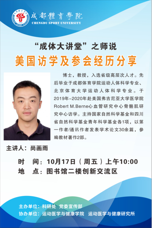 学校将于2025年10月17日(周五)上午10:00在图书馆二楼创新交流区举行“成体大讲堂”科研讲座系列活动之师说。本次讲座特运动医学与健康学院尚画雨教授主讲。题目为:《美国访学及参会经历分享》。欢迎全校师生积极参加。